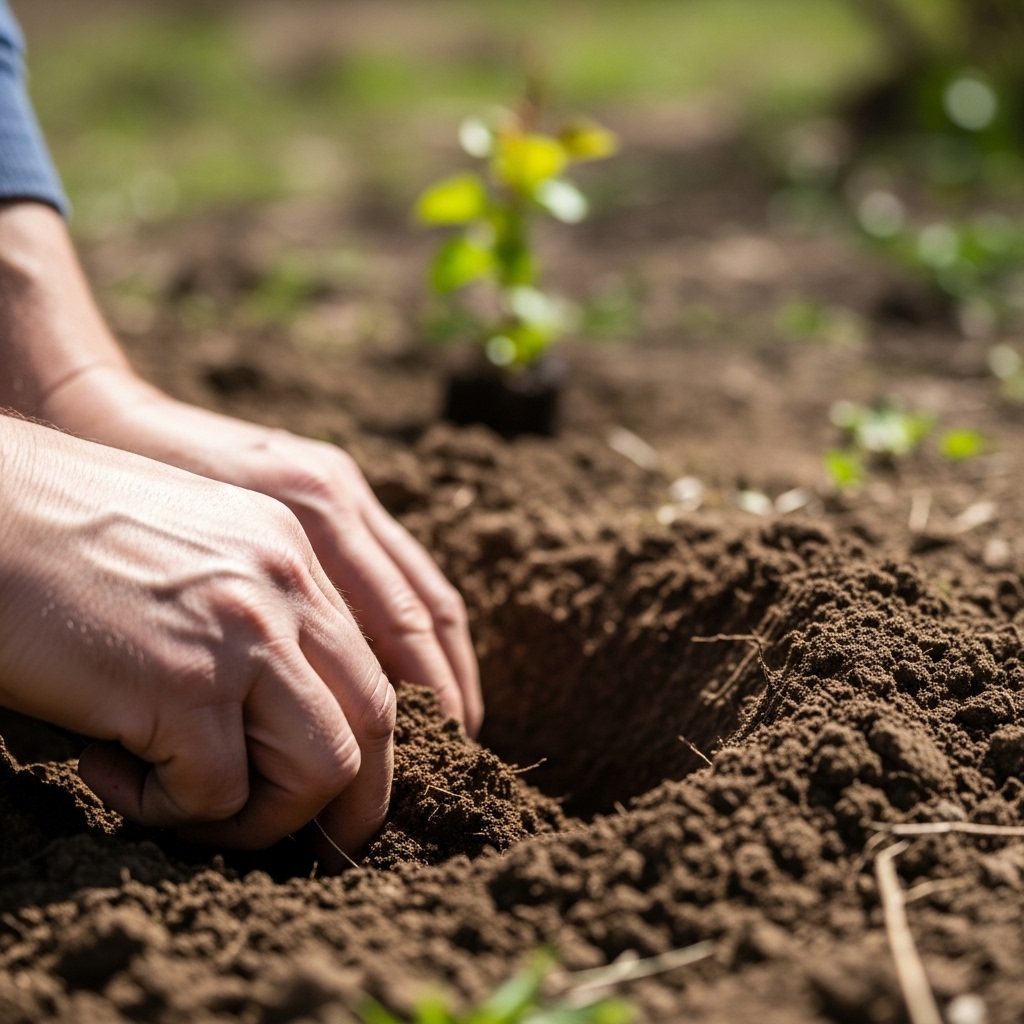 Кўчат ўтқазиш учун чуқур 60×60×60 см ўлчамда қазилади. Унинг тубига дренаж (шағал, ғишт) ва чиринди ҳамда боғ тупроғидан тайёрланган озуқа аралашмаси ётқизилади.
